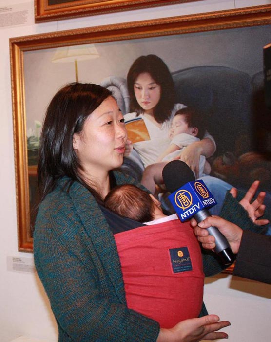 怀抱婴儿的安琪拉(Angela Mills)女士表示:“我一直知道(中共对法轮功学员的迫害)这件事。但是当看到这些画时,让我犹如感同身受。中共对法轮功学员的迫害让我感到非常愤怒。这也说明了,需要尽快制止迫害。”
