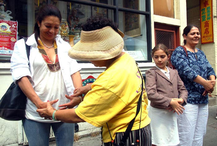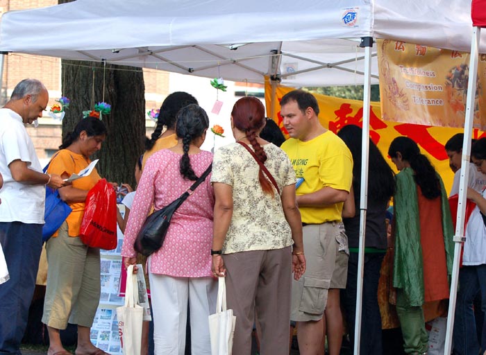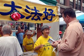 华埠中秋联欢节共有一百三十个摊位,法轮功的展位最为突出,展位前总是挤满了想要了解法轮功真相的人群。家住阿灵顿的Falma Ujur和家在老伦斯的Mary Tarshi当场就带着女儿学功,还表示要继续到炼功点学功。
