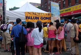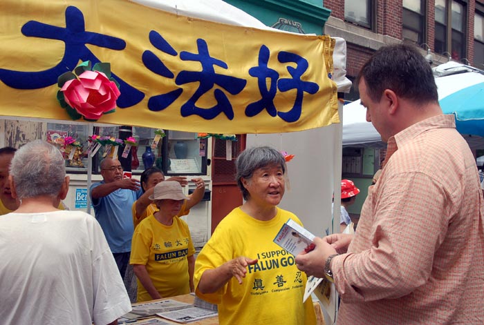 ![]() 在波士顿华埠中秋联欢上,法轮功展位前挤满想知真相的人群。 |