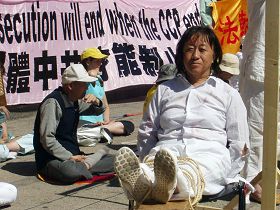 ![]() 二零零九年七月十九日,聂歌在温哥华法轮功学员纪念反迫害十周年活动中演示酷刑,揭露中共对法轮功的迫害。 |