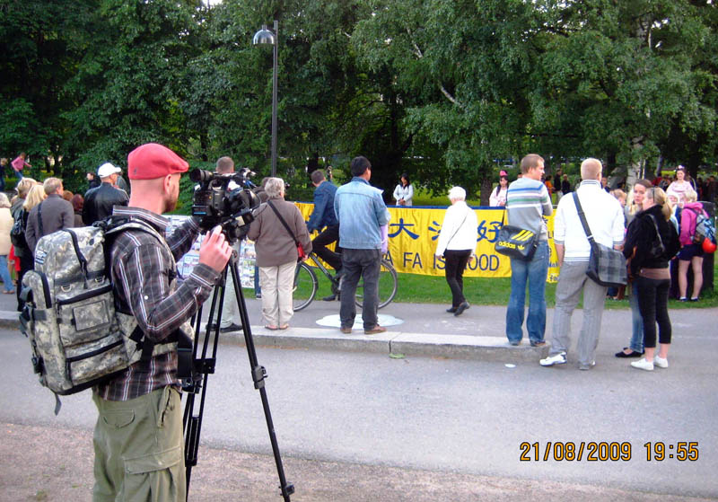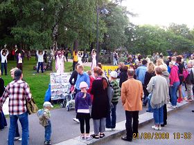 热闹非凡的公园里,虽然各种文化艺术活动名目繁多,法轮功学员的活动却俨然成为一道靓丽的风景线。学员们在优美的音乐声中演示的五套功法,吸引了很多人驻足观赏。人们纷纷拍录下这祥和的画面,接过学员递上的资料,或与学员交谈。他们赞叹:“很美”、“很祥和”,还有人建议学员到赫尔辛基各处去进行展示。