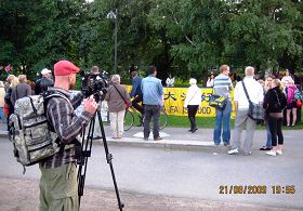 ![]() 媒体记者拍摄法轮功学员炼功场面 |