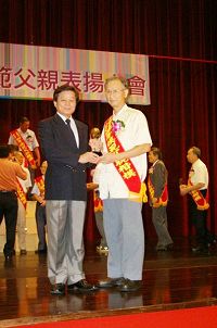 ![]() 陈柏湘(右)获选为今年台南永康市乌竹里的模范父亲,接受市长李坤煌的表扬。 |