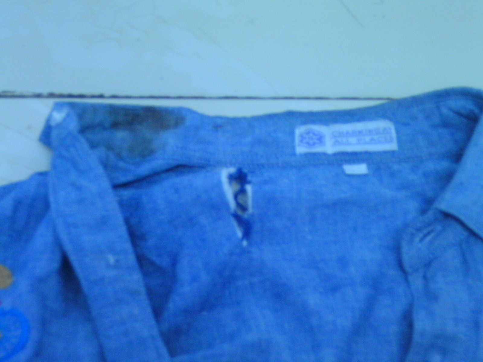 ![]() 衣服右领口的血迹清晰可见,衣服后背被撕破十厘米长一个口子,上边的三个钮扣被拽掉。 |