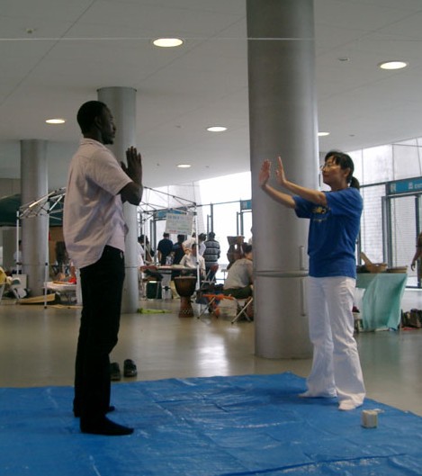 ![]() 旁边展位的黑人青年在学炼法轮功 |