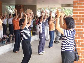 ![]() 参加研习的学员正学炼法轮功第一套功法--佛展千手法 |