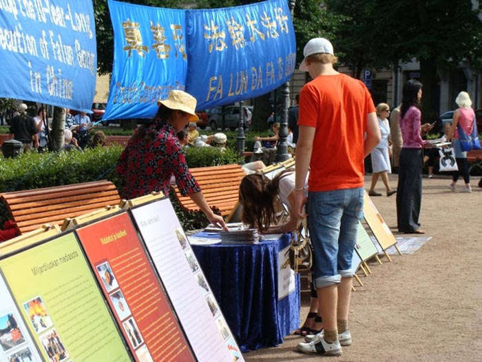 一位在慢跑的男士经过,特意停下来和学员聊天,他说:“共产党真是太可恶了。中国要是没有共产党,那里才会变好。全世界都没有共产党才会好。芬兰也是。你们这么做非常好。我衷心希望你们能等到(迫害停止)那天的到来。”他非常高兴能和学员交流,也很愿意仔细阅读关于法轮功的资料。
