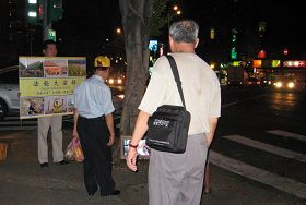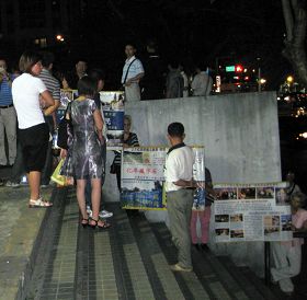 有的趁着进出夜市门口上下阶梯之际放慢脚步偷瞄真相展板;有的大方到展板前看个究竟,甚至和法轮功学员对话;有的则是提早出来或干脆不进夜市吃东西,在展板附近溜哒,然后坐在夜市门墙边椅子上聊了起来:听说台湾法轮功很多,果真不错,到处都有法轮功,我看那个展板上的照片说法轮功在全世界有一百多个国家上亿人在炼,怎么在我们那儿就走了样儿了呢?她的同伴回说:“哪能全世界都好,就我们那儿不对劲儿,不是法轮功走了样儿,是共产党领导出了问题。”