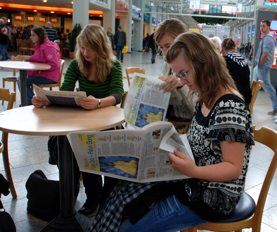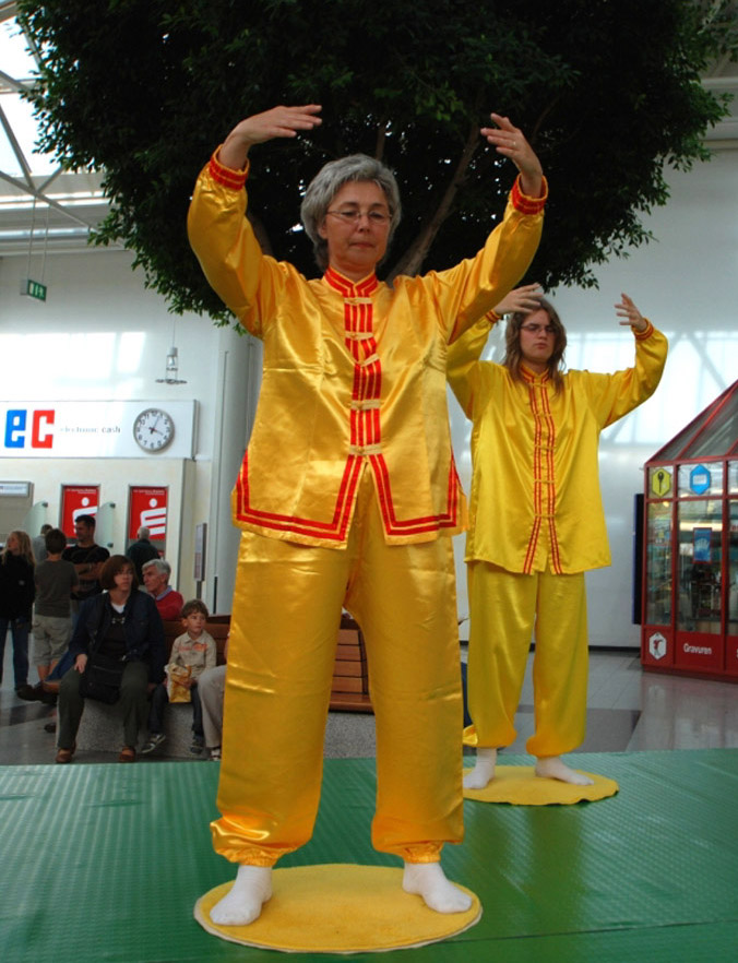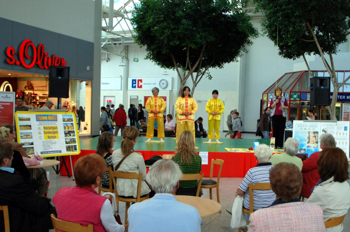 五日下午一点半开始,不来梅Weserpark购物中心大厅里,展台上的法轮功学员随着优美祥和的炼功音乐,向过往的行人展示五套功法。喧闹的购物大厅顿时安静下来,人们纷纷驻足观看。一些前来购物的市民则放下手中的拎包,坐在展台前的座椅上,仔细观看功法演示,另一些人饶有兴趣地阅读法轮功教功资料。