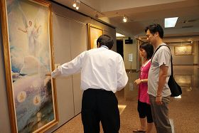 吴先生因为公司的主管邱经理,所以很想进一步了解法轮功。他觉得邱经理真是一个好人。这次趁同学的介绍赶在最后一天带着新婚太太一起来看美展。吴先生对《讲法图》感到很神奇,感觉找到了可遵循的道路。画展令他想开始看《转法轮》,更多了解法轮功。