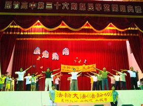 ![]() 高雄县路竹高中承办县民学苑开训典礼,法轮功学员现场演示功法 |