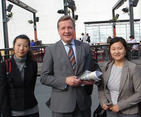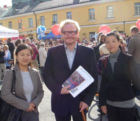 芬兰知名作家Jari Tervo与Hameenlinna的市长Tapani Hellsten 对法轮功学员赠送的真相光碟和资料很感兴趣,他们与法轮功学员合影,并表示愿意帮助更多的人了解法轮功被中共迫害的事实。