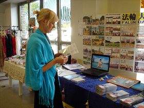 当地一位年轻时尚的女士在法轮功展位前驻足将近一个小时,细细地研读了真相资料,观看了教功录像和学员的演示后,非常感兴趣,买走了大法书籍。