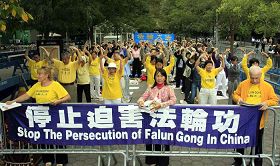 ![]() 法轮功持续三日在联合国大厦外集会,抗议中共迫害。 |