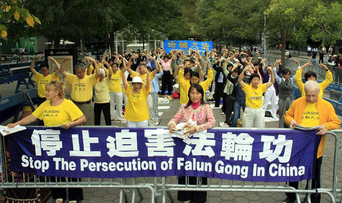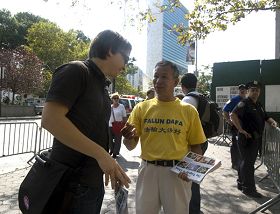 法轮功学员已连续三日在联合国大厦外集会,是自峰会开幕以来少数能持之以恒的团体。法轮功学员抗议中共对人权的践踏,呼吁国际社会不要被中共的谎言所蒙骗,关注法轮功学员被酷刑折磨、被活体摘取器官,共同制止迫害。
