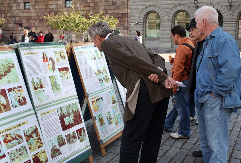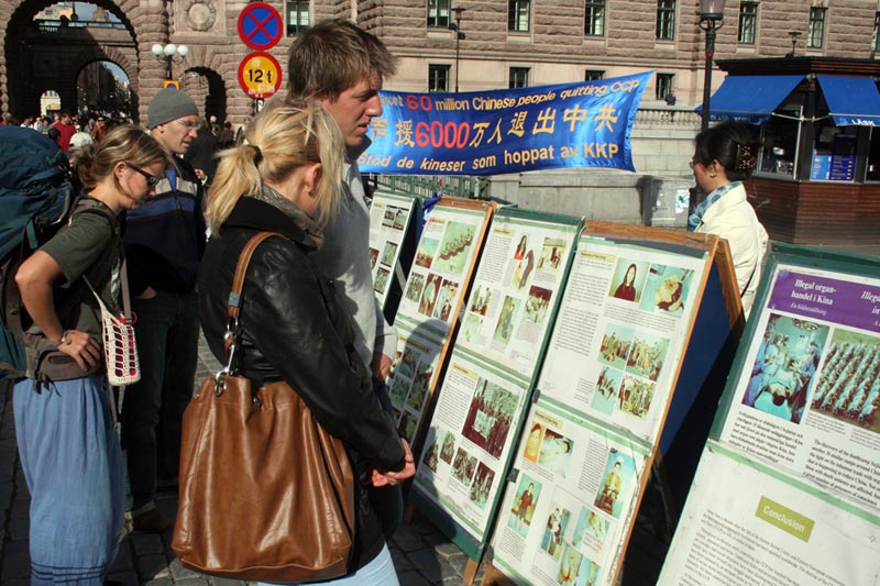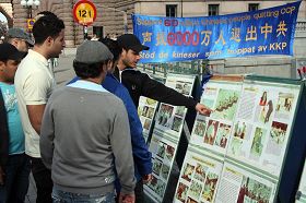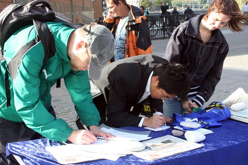 当天上午,斯德哥尔摩天气晴朗,阳光明媚。在活动地点,各种揭示中共罪行的真相展板及横幅,吸引过往的人们驻足观看。在了解了中共残酷迫害中国人民的真实历史,特别是看了揭露中共活摘法轮功学员器官的展板后,人们表示难过和愤慨。他们纷纷签名,谴责中共暴行,同时表示需要制止迫害。
