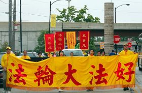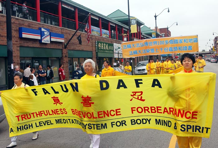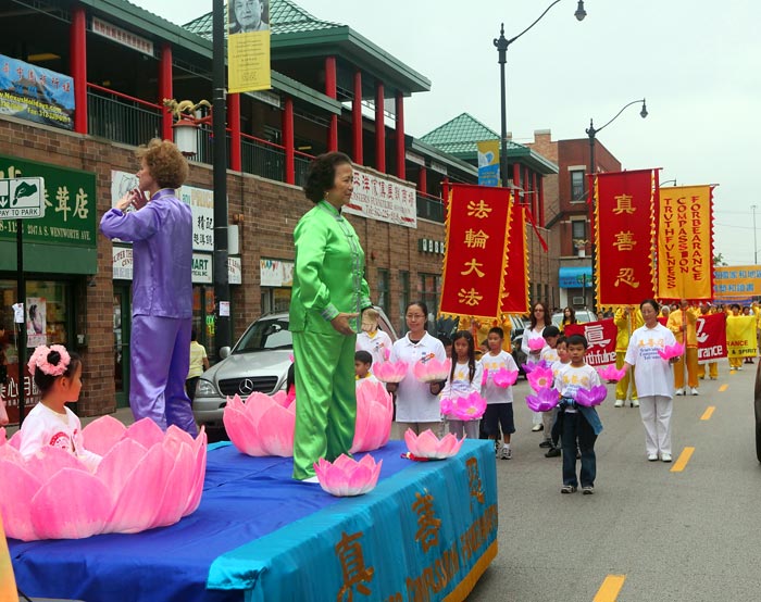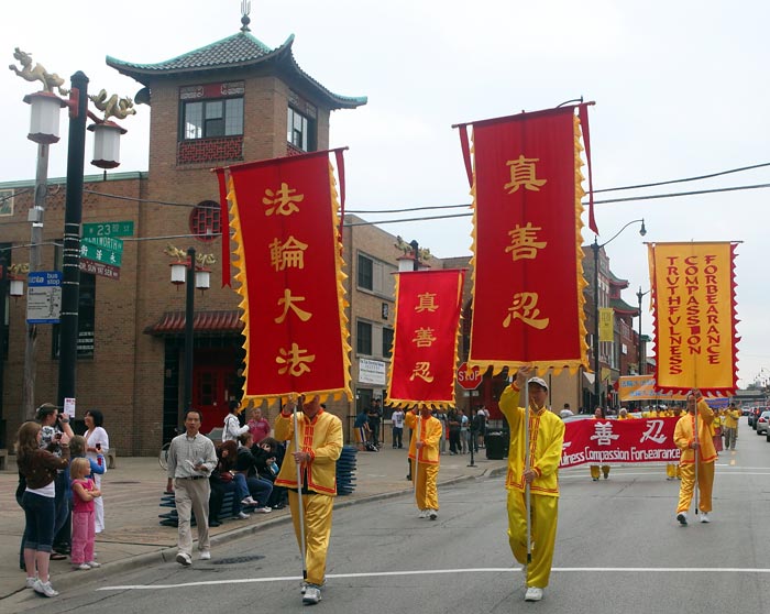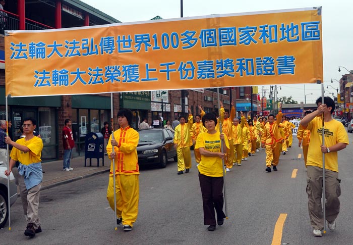 长期以来,芝加哥学员持续地在利用周末的时候在中国城炼功、讲真相、劝三:退.(退出中共党、团、队)。随着中国城里明白真相的人越来越多,华人的态度也在悄悄地变化:游行过程里,有的华裔家长指着横幅在教孩子读念,并欣然接受了真相资料;有的微笑友好地冲学员挥手,有的告诉同伴:“我在看法轮大法的队伍呢!”更多的华人举起相机,留下这个美好的场面。