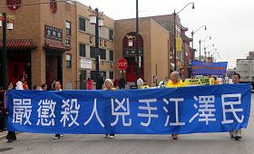 星期六,芝加哥的中国城忙碌,热闹。在法轮功学员准备游行期间,很多路人就已经不自觉地停下了脚步观看。随着警车开道,法轮功的游行队伍亮起巨大的书写着“法轮大法”、“真善忍”的旌旗,游行开始了以后,道路两旁的,包括商店的二楼都挤满了围观的人群。