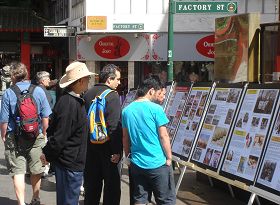 集会上还通过街头剧的形式向人们展示了中共执政六十年里发动的历次运动带给中国人民的深重灾难,特别是中共迫害法轮功修炼者,活摘法轮功学员的器官牟取暴利的暴行,引起很多路人的驻足观看,很多人表示对披露出来的中共暴行感到震惊。当天的大型图片展也吸引了不少民众了解真相,当天就有数十位华人现场退!党!,并有不少澳洲民众在请愿信上签名表示支持。