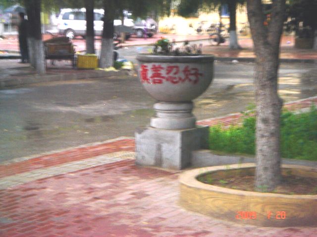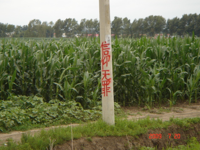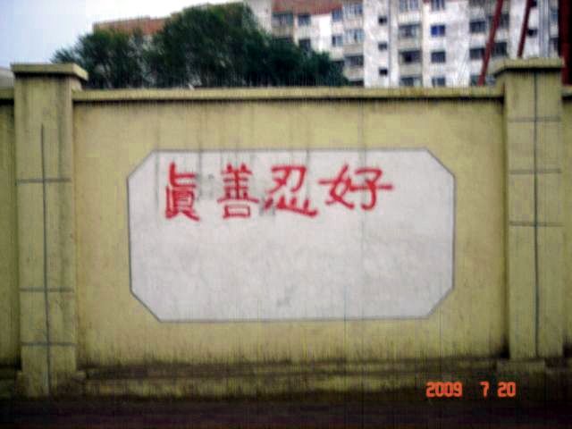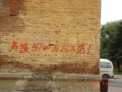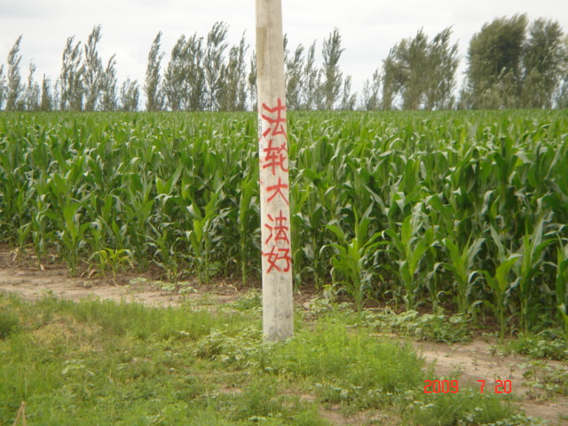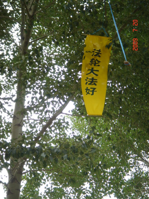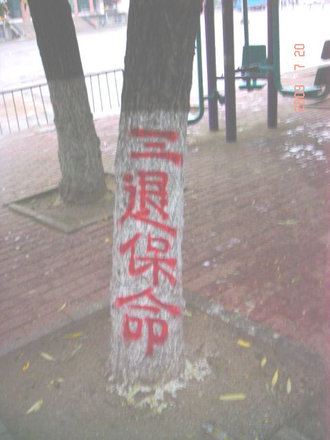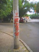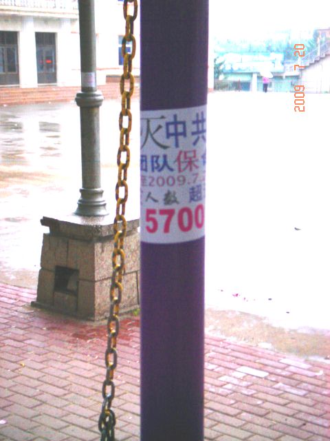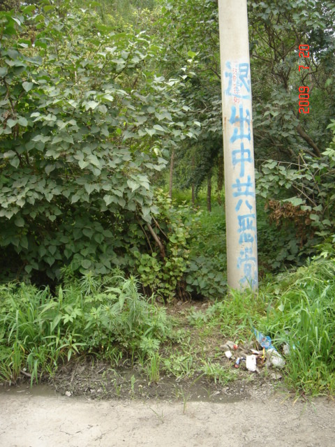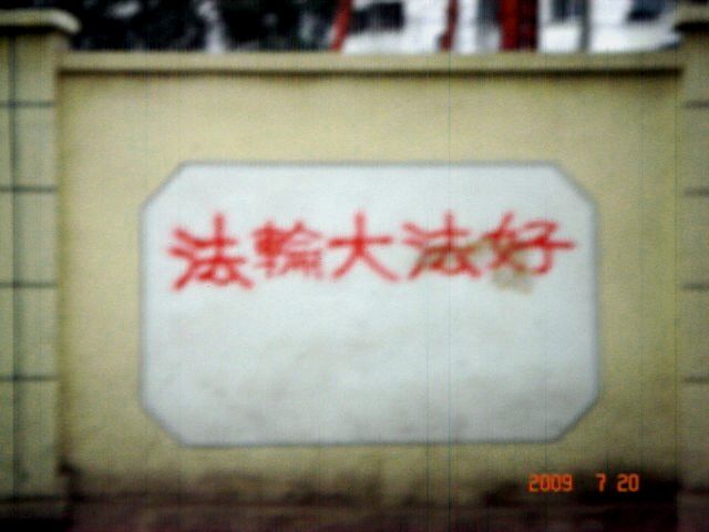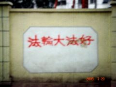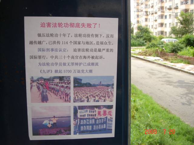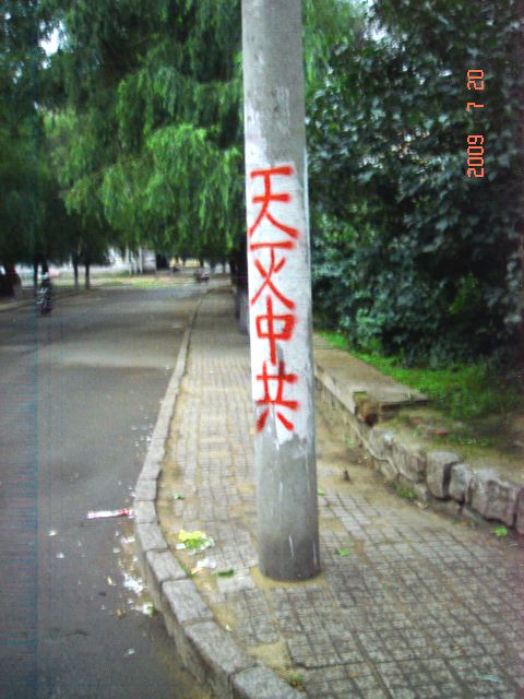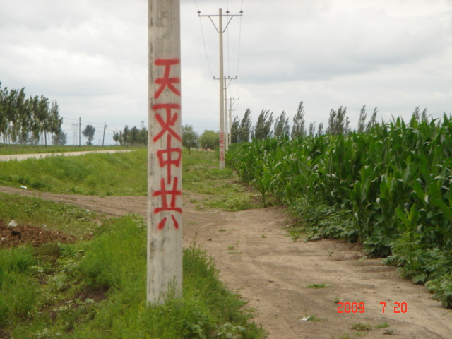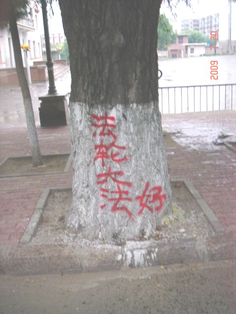 这是在大陆东北某市城乡道路两边的电线杆上、大树上、家属楼的墙上、家属楼的门上、学校周围的大树上及体育广场的立柱上等地方出现喷漆和不干胶标语:“天灭中共、退!党!保命”、“声援五千七百万人退!党!”、“驱除中共恶党,还我中华”、“真善忍好”、““法轮大法好”、“停止迫害,信仰无罪”、“平反法轮功,法办江泽民”等;