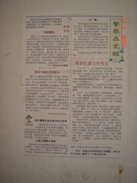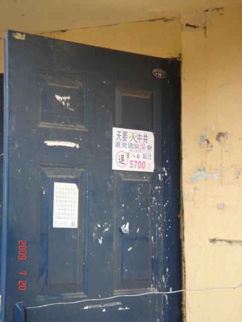 不干胶上写着:“天灭中共,退!党!团队保命,截止2009年7月20日三:退.已超5700万人”、“·九·评*掀起5700万人退!党!团队”、“中国大陆公安国安迫害法轮功恶报知多少?”、“立即停止对法轮功的迫害”、“警察觉醒了”、“迫害法轮功彻底失败了”、及退!党!声明等。