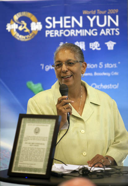 北卡州格林斯伯勒市市长伊芙•约翰逊(Yvonne Johnson)在演出结束后为神韵演员颁奖。