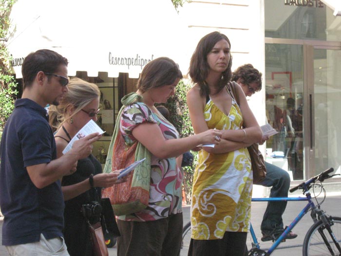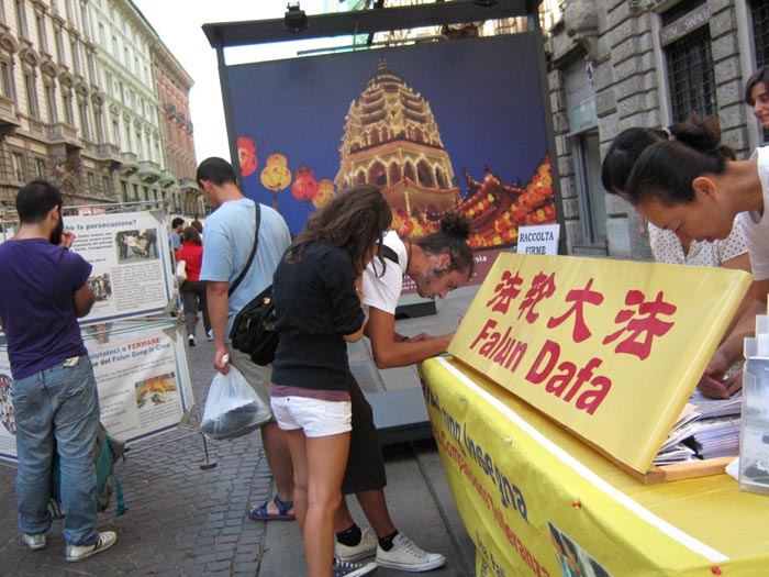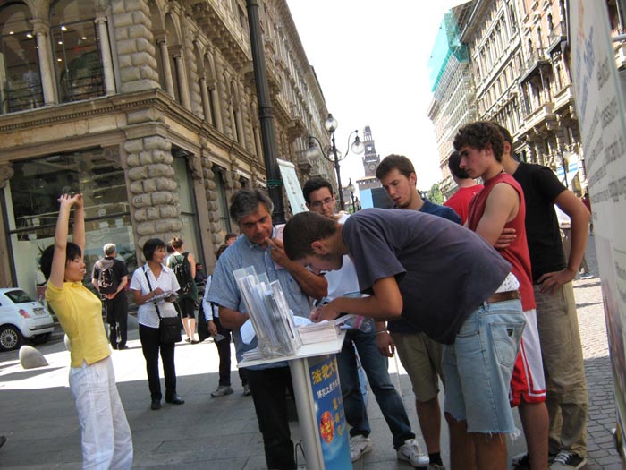一个意大利中年男子问:“法轮功是什么?中共为什么要迫害法轮功?”学员说,“法轮功是一种中国传统的修炼,对人身心有益。法轮功弘扬‘真、善、忍’,与中共 ‘欺骗、谎言、斗争、暴力”的思想正好相反,中共不允许人们有信仰自由和说真话的权利。中共在一九九九年开始对法轮功灭绝性迫害,至今已经十年多了,已经知道的有三千多法轮功学员被迫害致死,中共还残忍地利用军队、医院秘密摘取法轮功学员的器官,贩卖牟取暴利。现在国际社会已经在调查中共迫害法轮功的残酷罪行。”