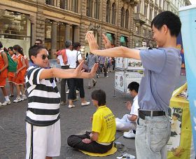 这名男子听完后,露出明白的神色,他表情严肃地向法轮功学员做了个合十的动作,并表示“祝福法轮功(Auguri)!”