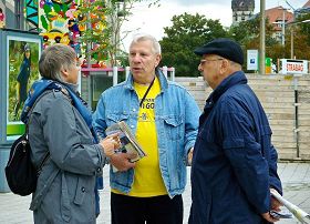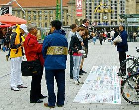 一位中国老人随家人一起来德国旅游。他开始对学员递给他的免费资料表示怀疑,说这些资料的费用是否都是德国政府提供的。法轮功学员微笑着告诉他,这些资料的印刷费用是每一位法轮功学员用自己日常工作的工资所得、打工所得,甚至很多都是从自己的生活费中,一点点节省下来的。老人明白了,微笑着拿走了所有种类的资料,并表示,一会儿在火车上一定仔细读一读。虽然他不是党员,但他也会考虑一下法轮功学员告诉他的关于退出中共的信息。