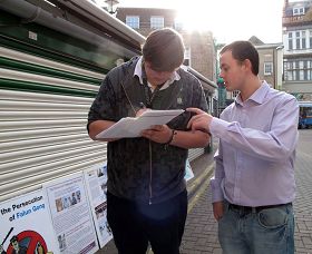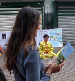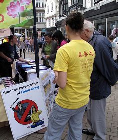 学员们注意到有一些人在真相信息台附近停留良久,或者走了又来,就是为了有机会多了解一些法轮功真相。一位中年英国男士在反迫害征签表上签字后离开,过了一会儿又来了,眼睛在桌子上的真相资料间仔细搜寻。这时一位学员递给他一个英文《·九·评*共产党》真相光盘,告诉他看了这个能明白中共邪*党-为什么迫害法轮功,又给他找了一份讲真相的英文专刊报纸,接过这些真相资料后,这位英国人满意地离开了。