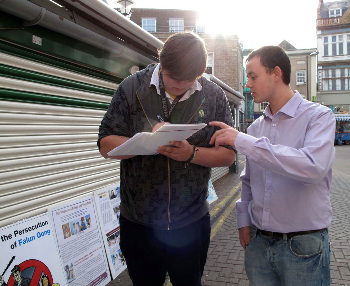 杰克(Jake)是个在肯思顿大学读书的大学生,这个大个子小伙儿在真相展板前看了很长时间,又站在一旁观看功法展示,直到活动快结束了他仍然没有离开。学员罗博特走上前去和这位英国男青年交谈。进一步了解真相后,杰克告诉罗博特,他认为大家应该一起努力制止中共邪*党-对法轮功的迫害,随后,杰克在反迫害征签表上签字。