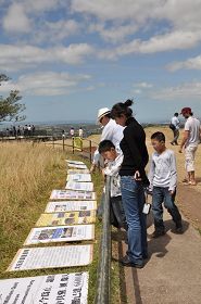 十日下午,天气晴朗,山上的法轮功学员正一如既往地向游客发着资料,阿卡若纳酋长穿着毛利民族特有的服饰在两名友人的陪同下登上山顶。他首先认真地观看了铺在地上的展板,就其中的有关问题与法轮功学员和身边的朋友交换了意见,在接受记者采访时,酋长表示:“我今天来这里就是为了表达对法轮功的支持。我的部落百分之一百地支持法轮功,而我个人百分之一百五十地支持法轮功。”