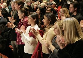 ![]() 演出结束时,观众起立鼓掌向演员致敬。 |
