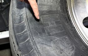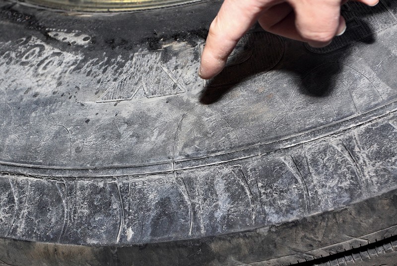 在蒙特利尔的Motor Coach International维修厂检查时发现,这2道划痕是被人用很薄的刀片刻意割出的刀痕。维修厂技工表示,这种刀痕最危险,不易被发现,但是会使轮胎在承重及高速行驶时爆胎,必须马上更换。
