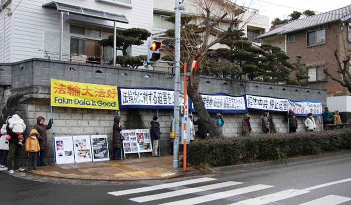 学员们于下午四点半就来到了长崎中领馆前,打开“法轮大法好”、“声援全球退出中共组织人数突破六千六百万”、“立即停止对法轮功的迫害”、“制止中共活体摘取法轮功学员器官”等横幅以及揭露迫害的真相看板,整齐地站在中领馆的正对面人行道上,静静地单手拿着蜡烛,和平反迫害。