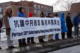 ![]() 渥太华神韵支持者于二零一零年一月二十四日,在中使馆前的抗议港府屈从中共。 |