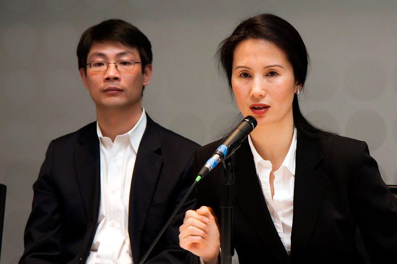 ![]() 神韵巡回艺术团团长李维娜(右)及舞台监督徐侃刚(左)在记者会上。 |