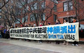 ![]() 多伦多民众在香港特别行政区政府驻多伦多经济贸易办事处外集会,抗议港府配合中共,阻挠神韵晚会在香港演出。 |