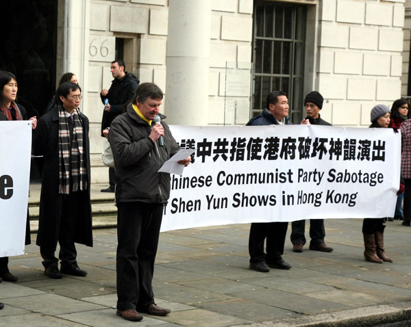 一月二十三日下午,部份伦敦法轮功学员及旅英华人在中共使馆前集会,抗议中共破坏神韵原定在香港的演出。人们打出了“强烈抗议中共指使港府破坏神韵演出”和“捍卫香港自由和一国两制”中英文字样的横幅。