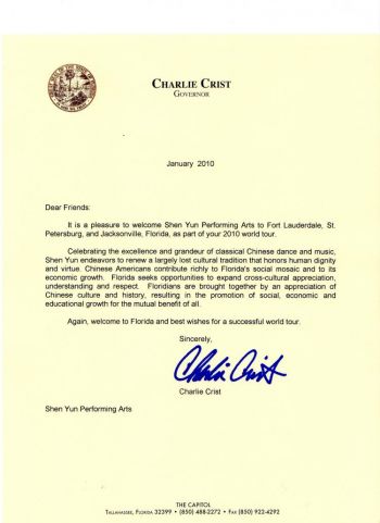 佛州州长查理·克里斯特(Charlie Crist)祝愿神韵艺术团的全球巡回演出成功。他写到:“庆祝中国古典舞和音乐的卓越和宏伟,神韵艺术团努力再现很大程度上丧失了的、珍视人的尊严和美德的文化传统。”