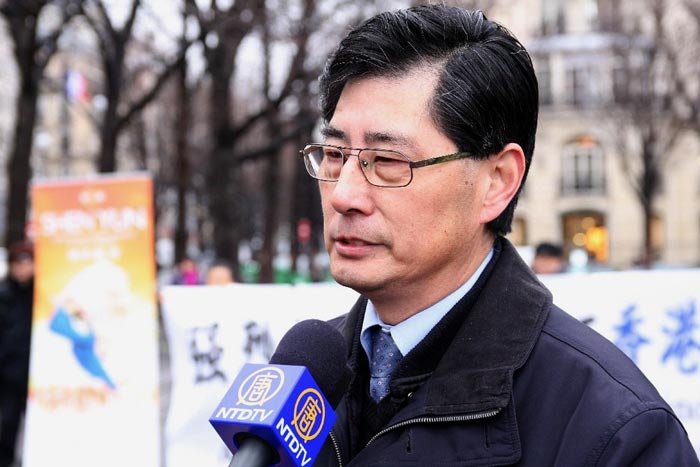 法国神韵演出主办方在巴黎中使馆前抗议中共干扰神韵香港演出。 |