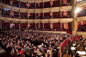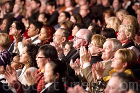 ![]() 二零一零年一月三日,美国费城音乐学院剧场中,观众兴致勃勃地欣赏神韵晚会 |