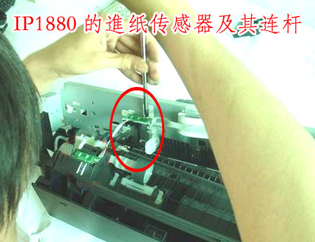 下图为佳能IP1880的進纸传感器和控制杆,其它型号的進纸传感器位置都差不多: