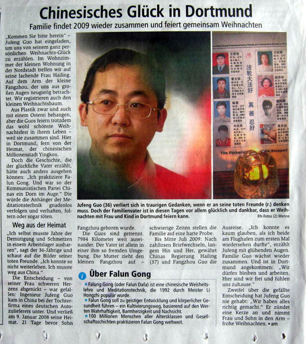 该报纸在平安夜的头版导读栏中的第一篇导读文章中写道:“来自中国的郭居峰全家曾经被分开七千九百八十四公里,今年,这个家庭在多特蒙德重聚。这是他们在西方度过的第一个圣诞节。他们在德国享受着圣诞节美好的同时,也回忆了他们在中国曾度过的一段艰难岁月。那时,郭居峰经历了长时间的迫害。”