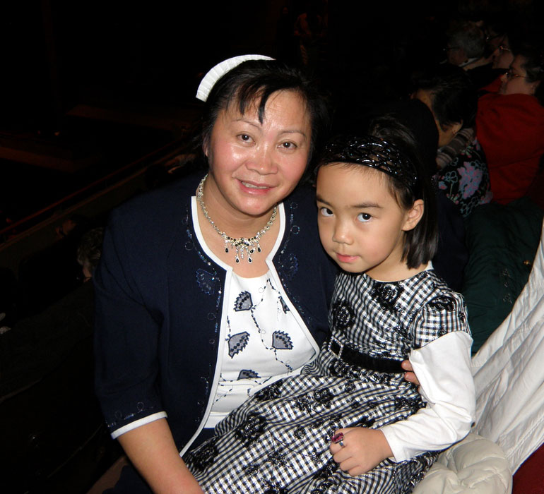 一月七日晚,来自大陆的新移民李缘的一家五口,来共享神韵国际艺术团的演出。图为李缘和女儿。