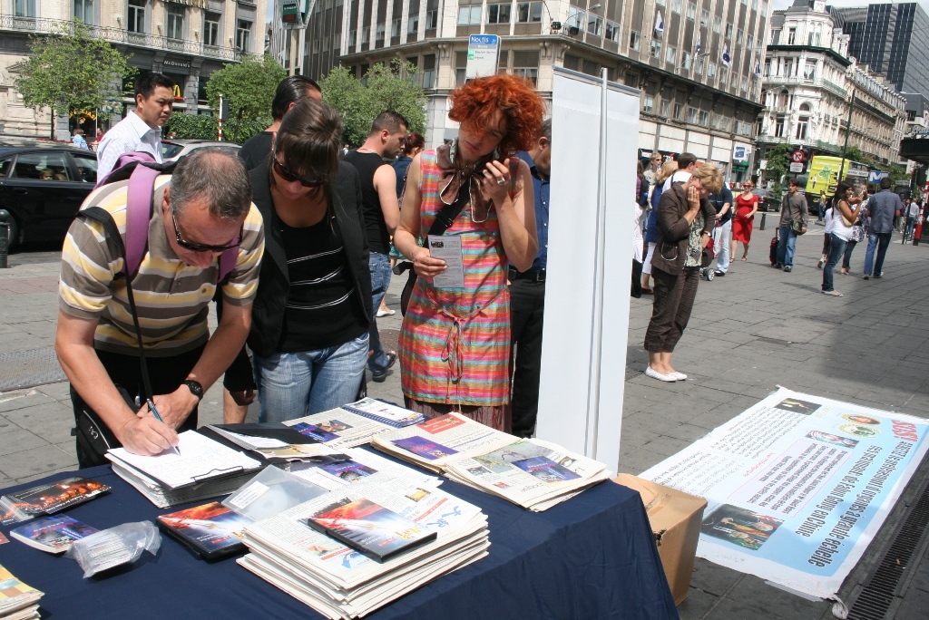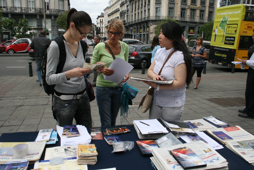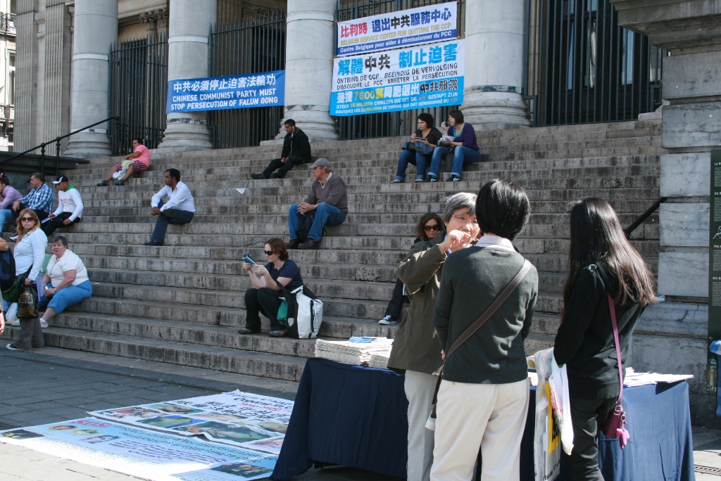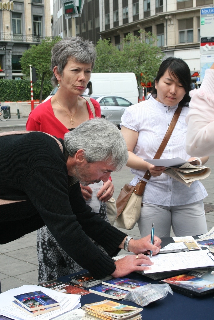 朱女士说,现在“三:退.”(退出中共党、团、队)的大陆游客也多了。有个青年男子,下了大巴就走到资料桌跟前,大声地对帮助他照相的同伴喊,走近点、走近点照。她接着说:现在即使一些人还有怕心,不敢带资料回国,他们还是希望把在海外看到的景象带回国给亲朋好友看,就不停地对着有“比利时退出中共服务中心,解体中共才能制止迫害,中共停止迫害法轮功”等大字横幅照相片,录制录像片。她说:法轮功学员相信善恶有报是真理,讲真相劝三:退.为的是使被蒙蔽的中国人摆脱在加入其组织时要为其“献出自己的生命”那个邪恶的誓言捆绑,邪恶的中共遭报应的时候,免除一起遭恶报的牵连。