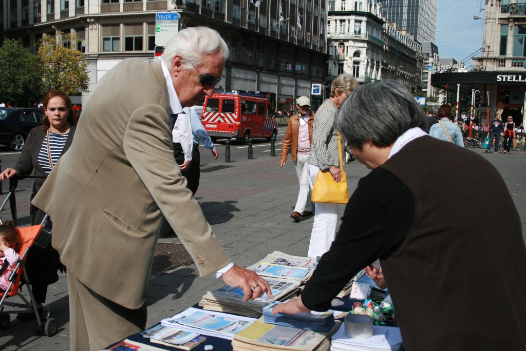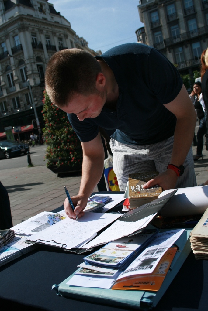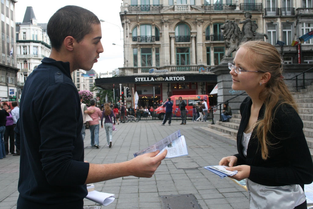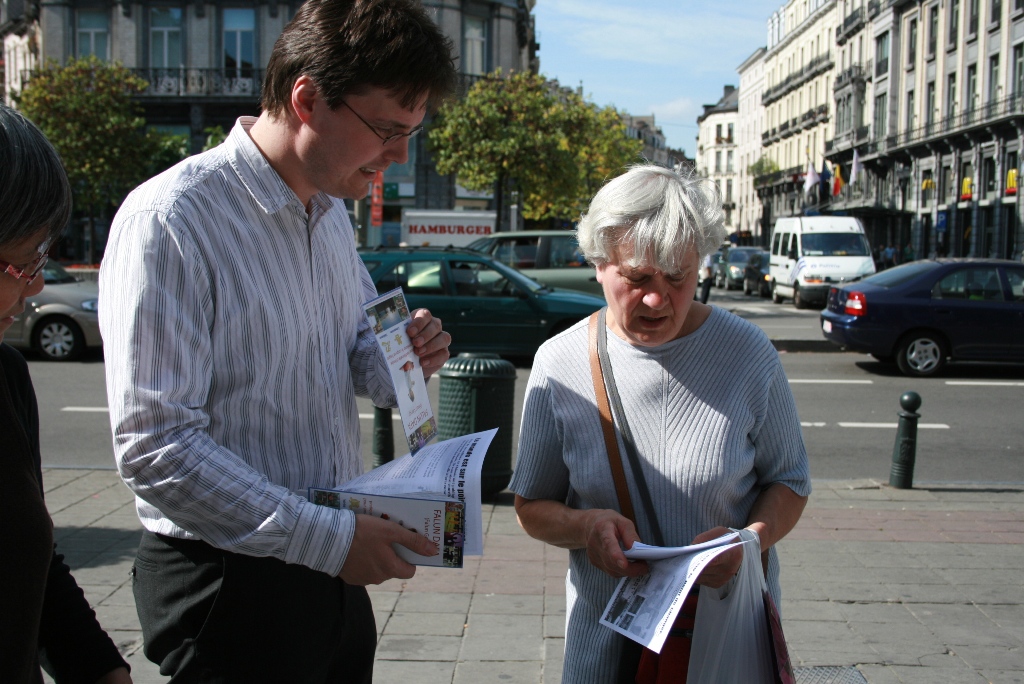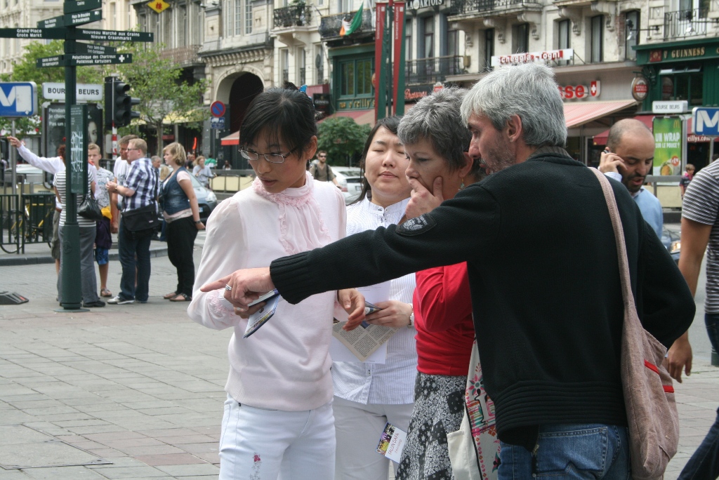 朱女士说,现在“三:退.”(退出中共党、团、队)的大陆游客也多了。有个青年男子,下了大巴就走到资料桌跟前,大声地对帮助他照相的同伴喊,走近点、走近点照。她接着说:现在即使一些人还有怕心,不敢带资料回国,他们还是希望把在海外看到的景象带回国给亲朋好友看,就不停地对着有“比利时退出中共服务中心,解体中共才能制止迫害,中共停止迫害法轮功”等大字横幅照相片,录制录像片。她说:法轮功学员相信善恶有报是真理,讲真相劝三:退.为的是使被蒙蔽的中国人摆脱在加入其组织时要为其“献出自己的生命”那个邪恶的誓言捆绑,邪恶的中共遭报应的时候,免除一起遭恶报的牵连。