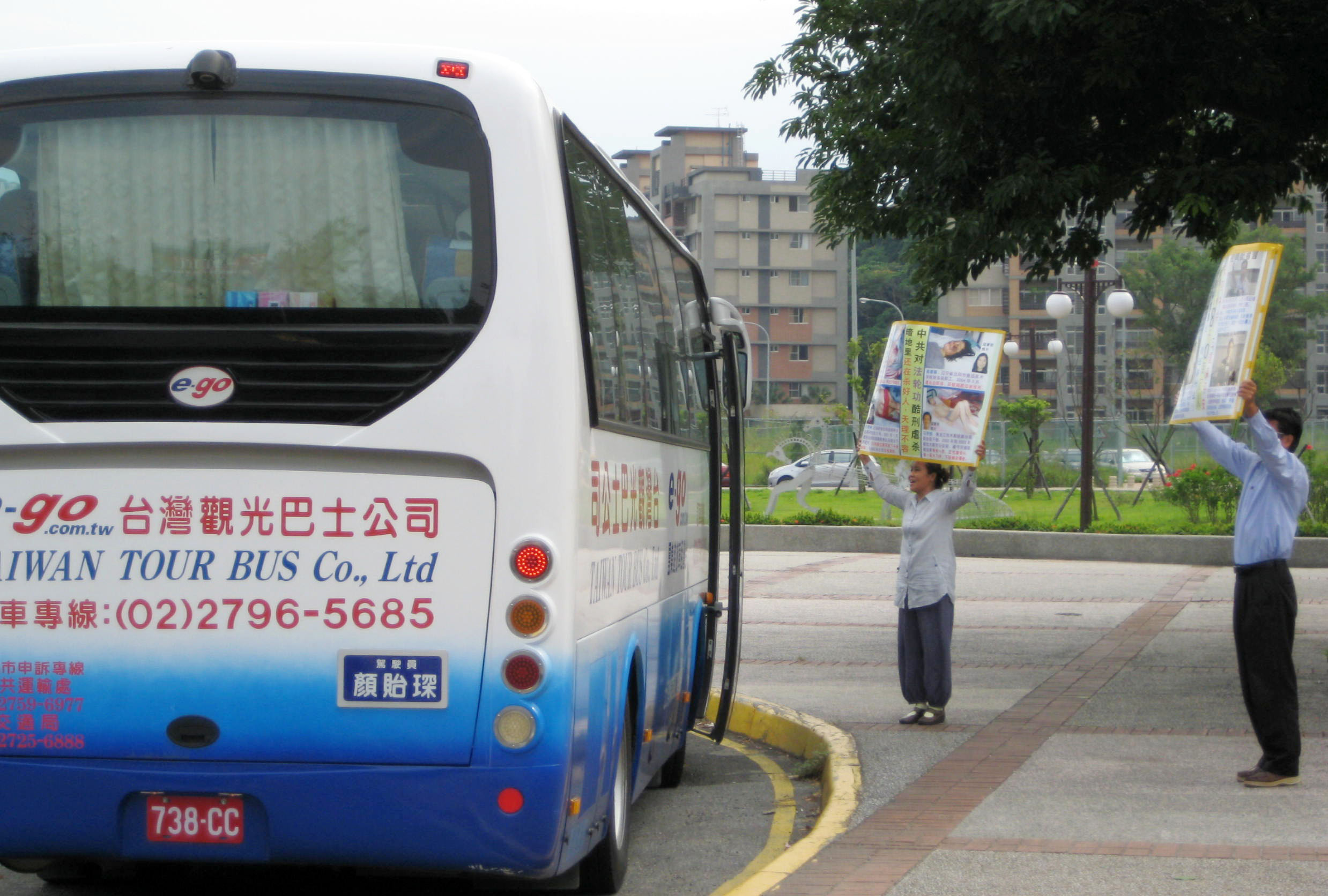 看着依依不舍的中国观光客,淑华和另一位学员赶过去站在人行道边,面向游览车举着真相展板,好让车上的大陆观光客把握时机多看多了解,车子启动缓缓驶开之际,学员向这些贵客挥手道别,车内许多人也使劲挥手,他们满面笑容,随着车子渐远,有的还在回头挥手。