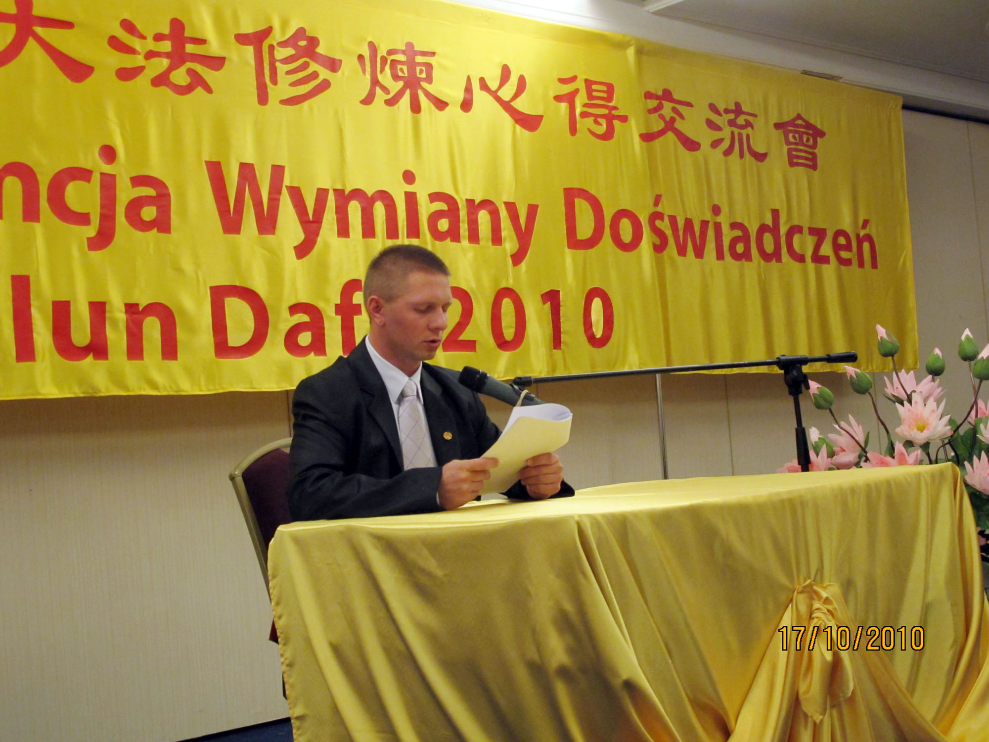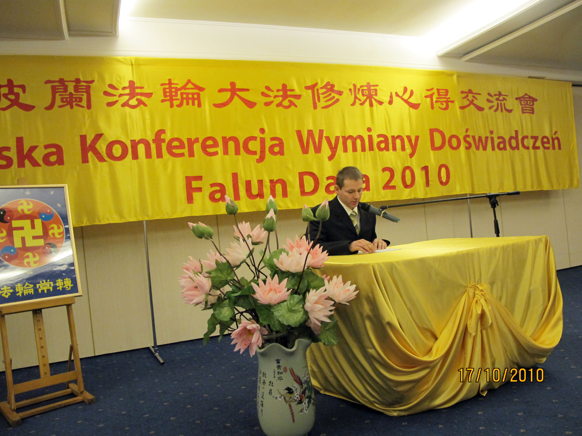 另一位西人学员汤姆克(Tomek)也与大家分享了他得法的经过及通过自学中文《转法轮》〈论语〉部份進而看懂全文,并在师父的加持下,成功的直接将《转法轮》翻译成波兰语,显示了大法的超常和神奇。