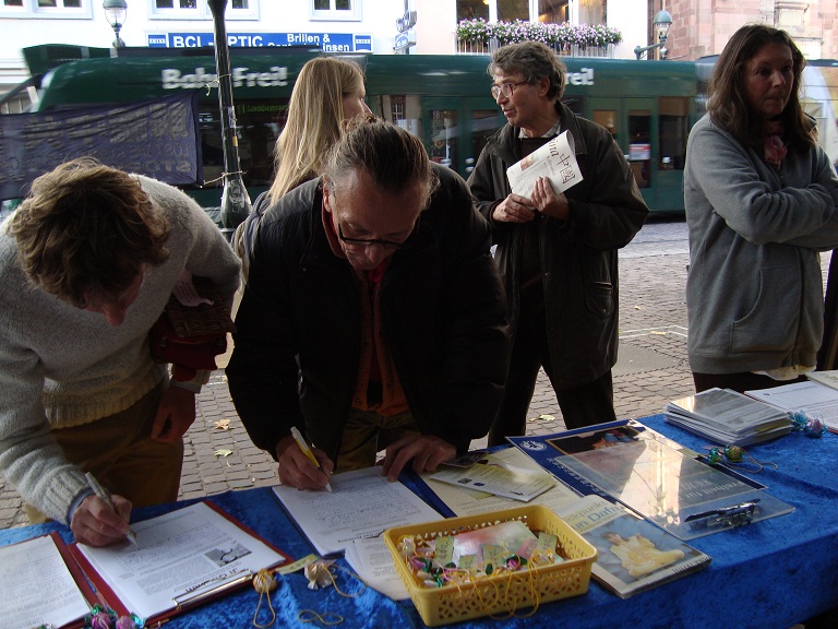 一位在征签簿上签完名的德国先生说,希望我的签名能对停止迫害有点小小的帮助。但是这太不够了,我们的政府呢?这样的罪恶超出了国家的范围,是反人类罪,世界上所有的国家和人民都应当站出来制止它。